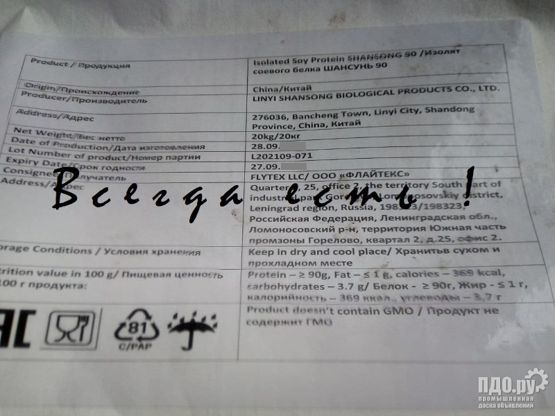 Адрес объявления: https://nizhnii-novgorod.z.bizon.ru/Prodazha/Izolirovannyj-soevyj-belkov-90-protsentov-kitaj_Prodam_10039882.html