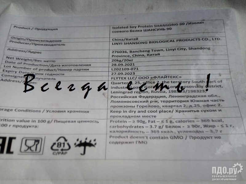 Адрес объявления: https://nizhnii-novgorod.z.bizon.ru/Prodazha/Izolyat-soevogo-belkov-90-protsentov-kitaj_Prodam_10031385.html